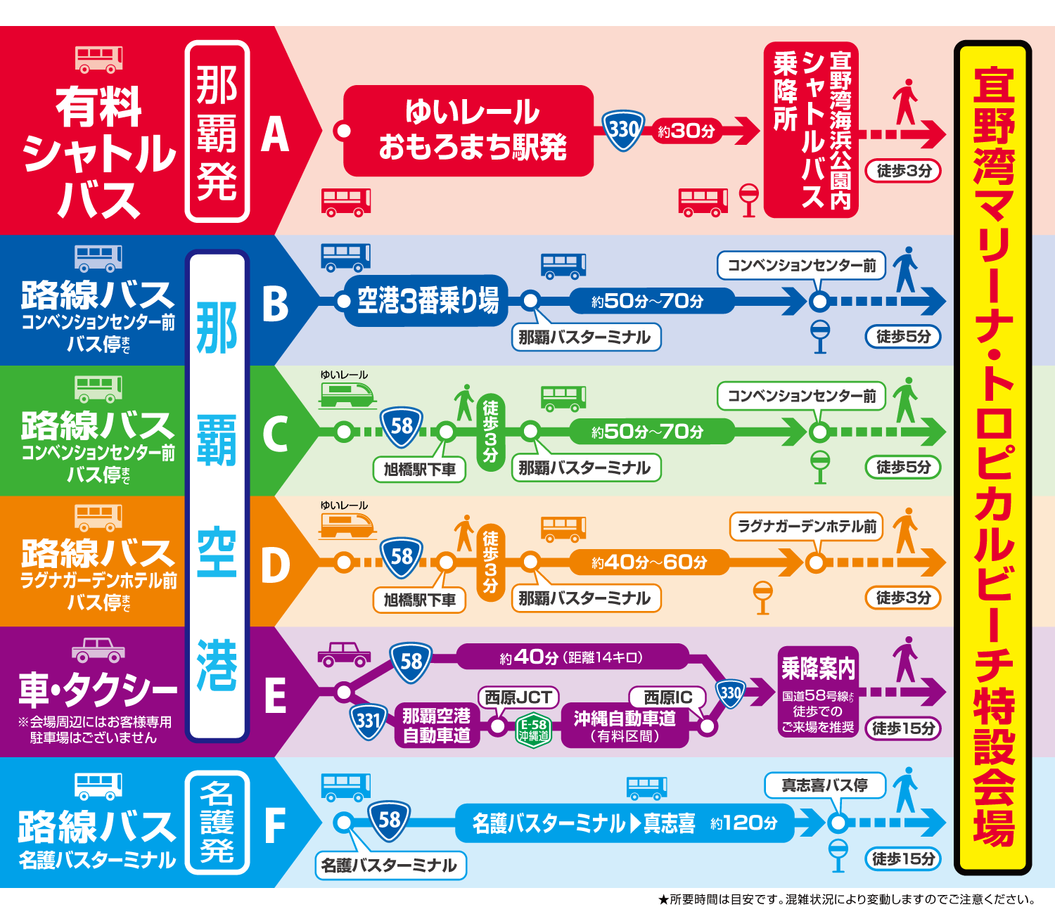 乗車地の混雑により、ご乗車頂くまで待機列にお並び頂く時間がある場合や、乗車後からバス出発まで時間を要する場合も